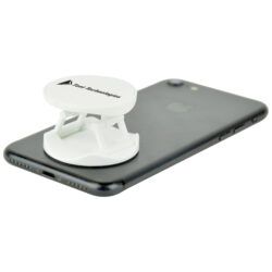 Slim plastic 2-in-1 phone stand and finger grip; simply pull the unit open when in use and fold away neatly after. Available in white.- Just Click Printing Company, Poole
